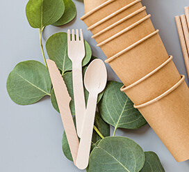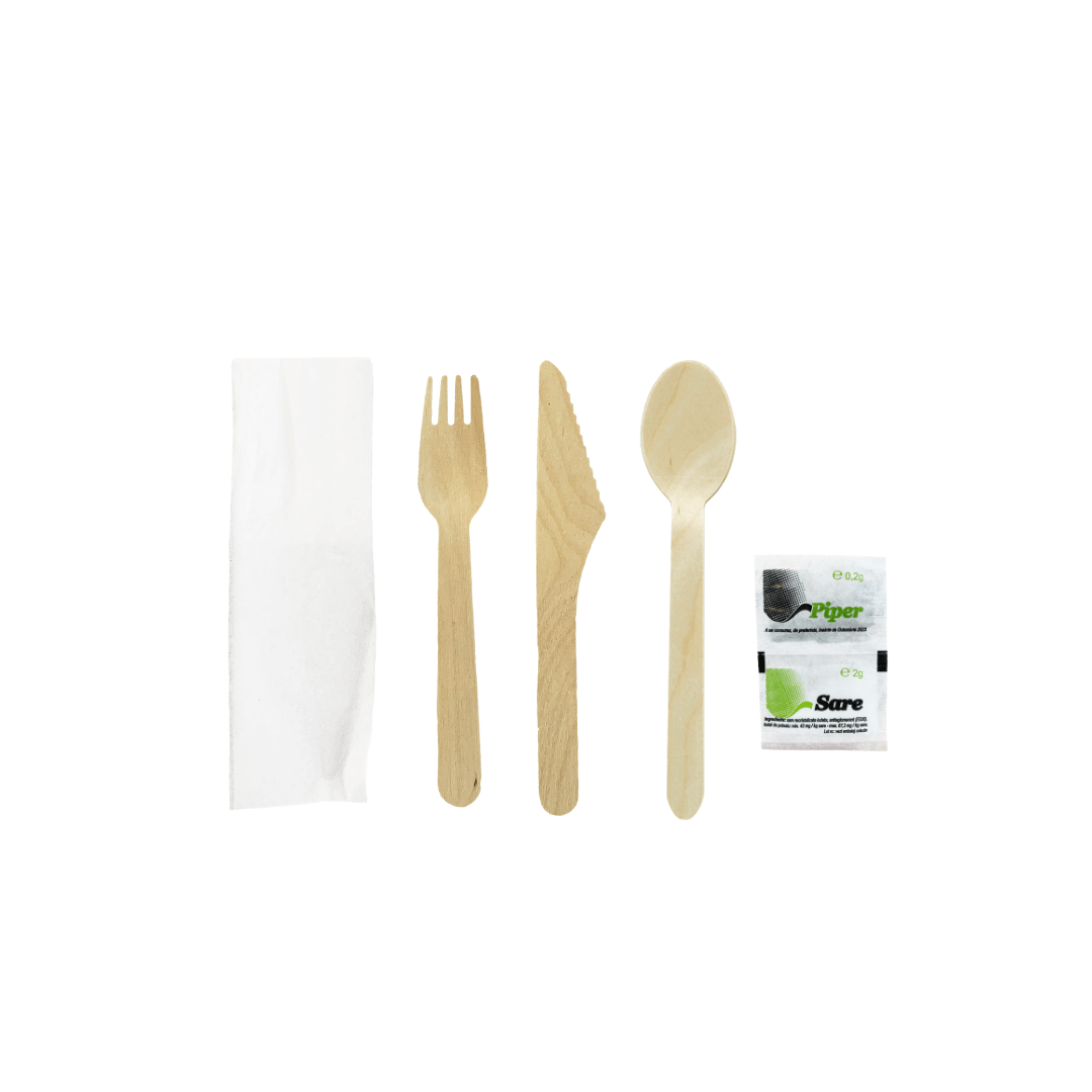 Set furculita, lingura si cutit din lemn de unica folosinta cu servetel alb si plicuri sare piper, in ambalaj sigilat.